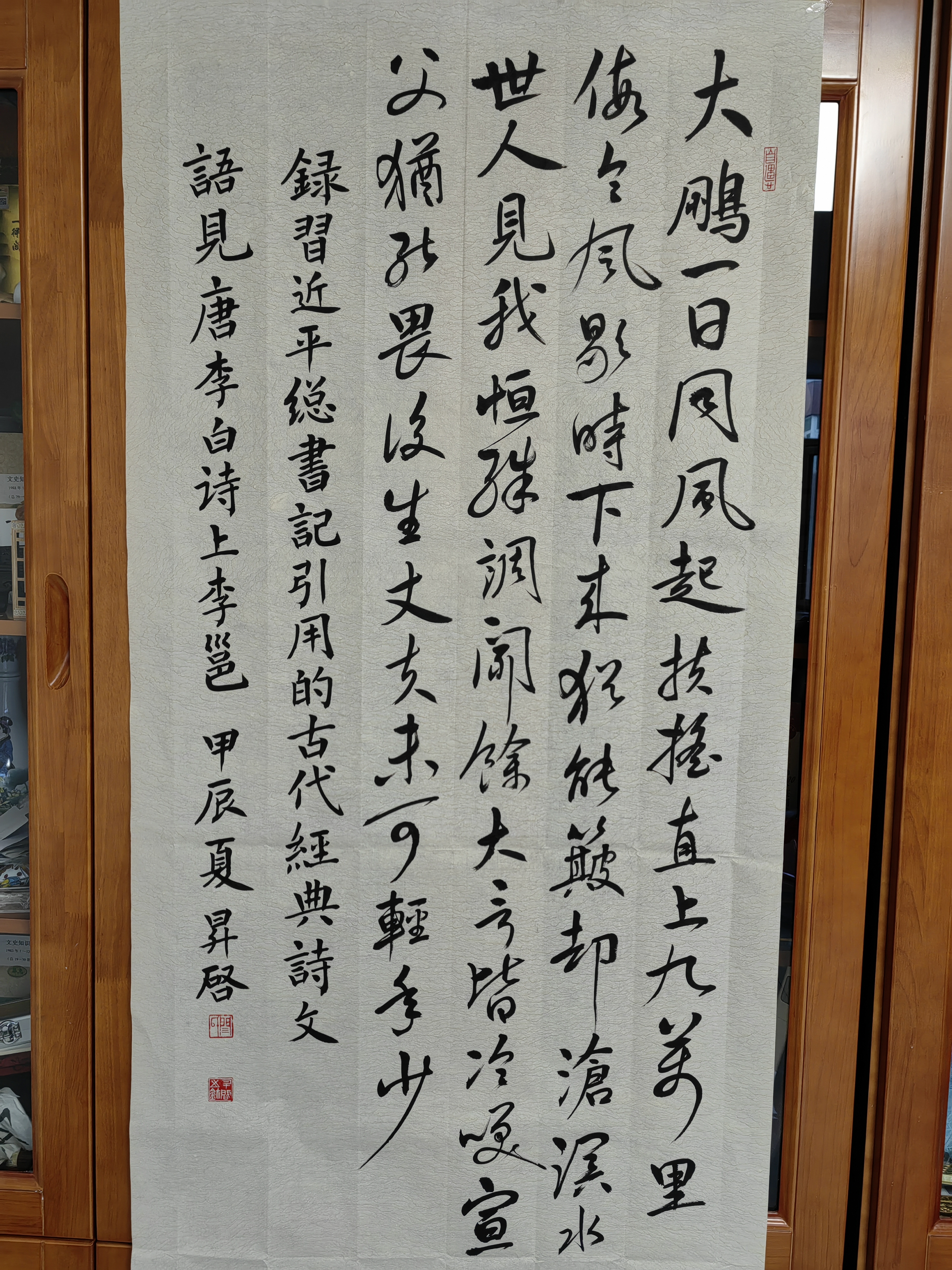 行書書法作品《上李邕》釋文:“大鵬一日同風起,扶搖直上九萬里。假令風歇時下來,猶能簸卻滄溟水。世人見我恒殊調,聞余大言皆冷笑。宣父猶能畏后生,丈夫未可輕年少?!?,